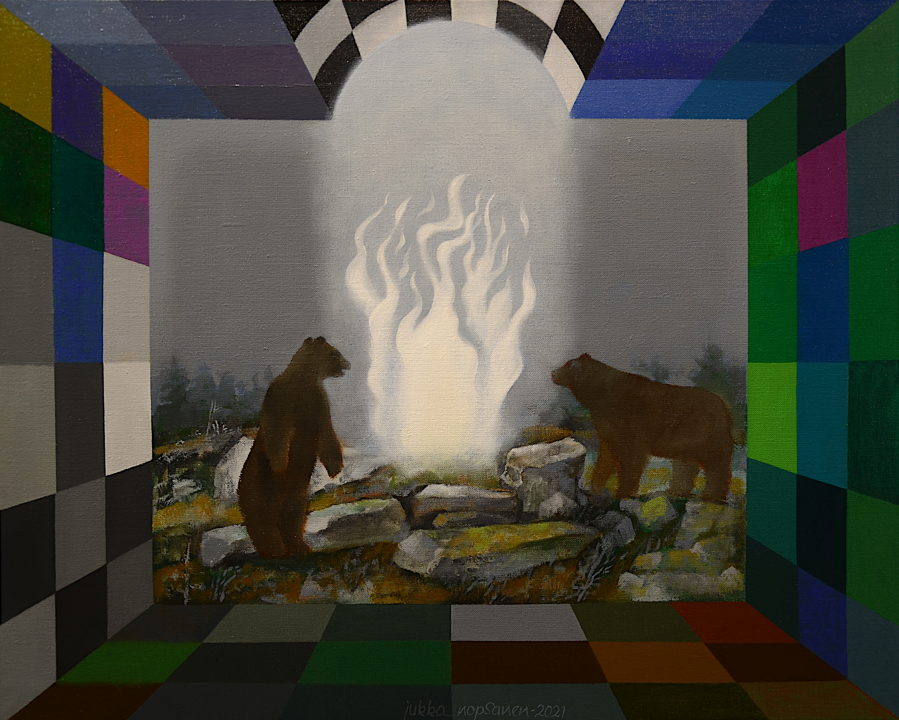Kuvan tiedotÖljyväri kankaalle, 65 x 81 cm, -2021Avainsanat: öljymaalaus, tila, maisema, eläin, karhu, kallio, kivi, valo, tuli, ruutu, surrealismi, ihme, palava pensas, Kuvakoot: Esikatselukuva Pieni kuva Suuri kuva Alkuperäinen kuva Kuvaa on katsottu 377 kertaa |